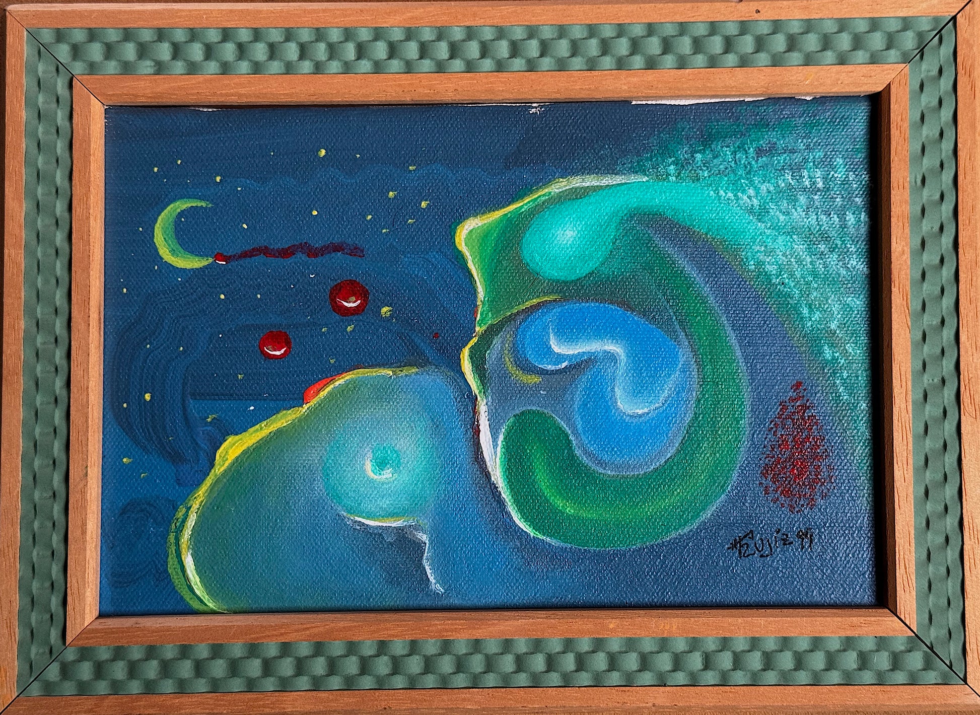 El cuadro Universo de Olores es como un viaje a través de los aromas y los recuerdos. Los colores azul y verde son como el aire cuando lleva un perfume, moviéndose suave y libre. Pintado en el 1999